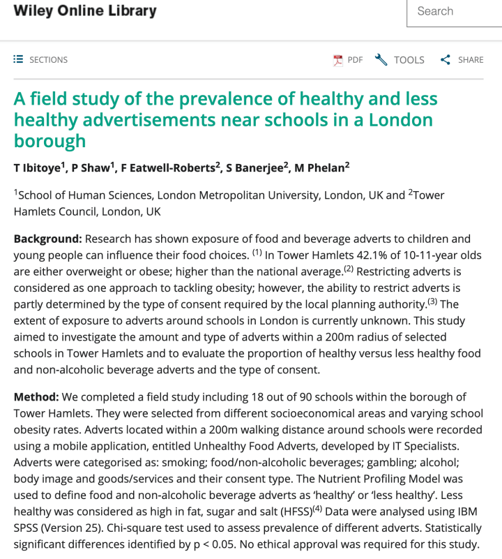 To our knowledge, our study is the first of its kind to be completed in London, similar studies have been done in some parts of Europe and New Zealand. Our study forms the basis for further research to be done to investigate the prevalence of HFSS ads near schools across the London region. We previously challenged the government to assess compliances to the Advertising Standards Authority (ASA) code where marketers are advised to ensure outdoor HFSS ads are not targeted at an audience which consists of more than 25% of under-16s.